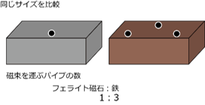 磁束を運ぶパイプの数は、およそフェライト1:鉄3ほどの比になります。このため鉄はフェライト磁石の約3倍の磁束を運ぶことができるのです。