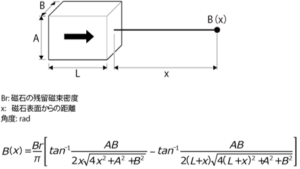 空間磁束密度は磁石単体の表面磁束密度とは異なる値ですのでご注意下さい。多くの場合、空間磁束密度は空間位置によって異なります。上式はあくまで目安としてご使用下さい。