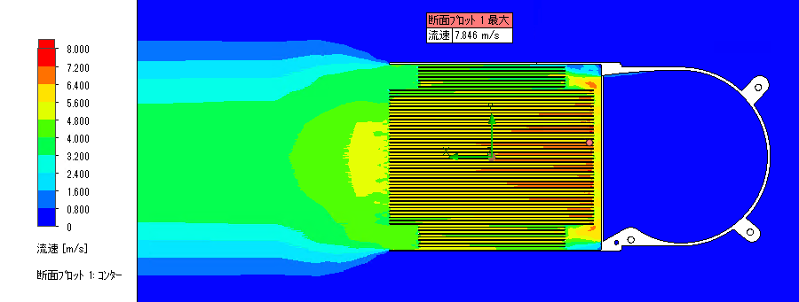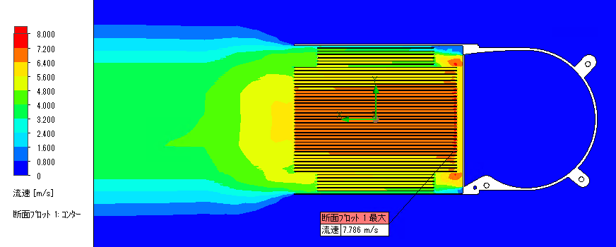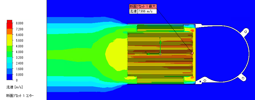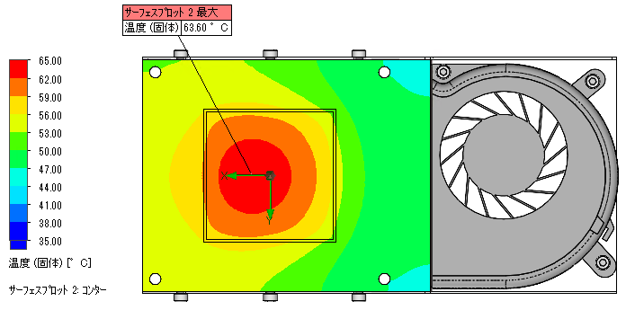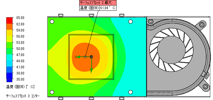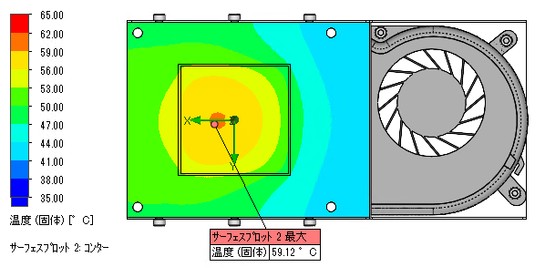 同じサイズ、同じ空冷条件にて、ヒートシンクのフィン枚数を変えたときの、熱源温度を確認し、形状の最適化を行います。